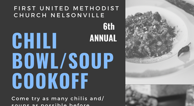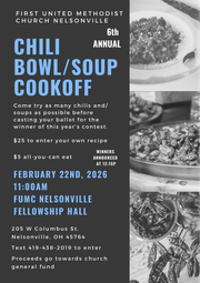 Please plan to attend this fun event after church on February 22 and help select the winning chili. The cost per person is $5. Contact event organizer Kaleigh Cox by text at 419-438-2019 or the church office at 740-753-1939 to enter your chili or soup in the contest. The registration fee is $25. Please consider printing the attached flyer to post or forward to people who may be interested. Copies are also available in the Betty Johnson Welcome Center.